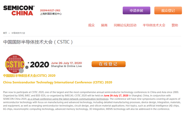 中國國際半導體技術大會(CSTIC)將于2020年6月26-7月17日在上海新國際博覽中心舉行。